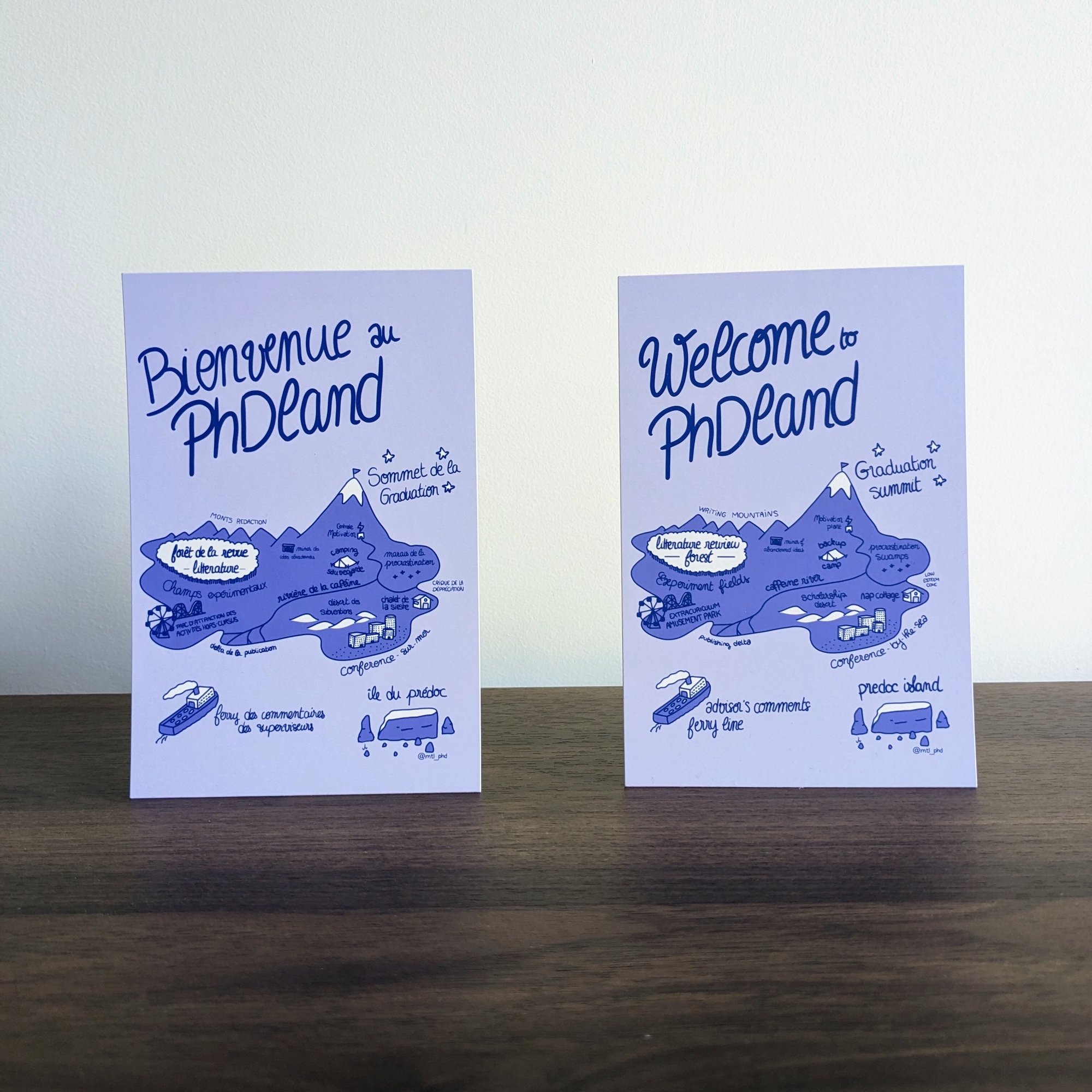 Une carte du PhDland pour essayer de s'y retrouver, pour offrir aux collègues qui viennent d'arriver (ou d'en partir) ou pour s'y convaincre d'y séjourner